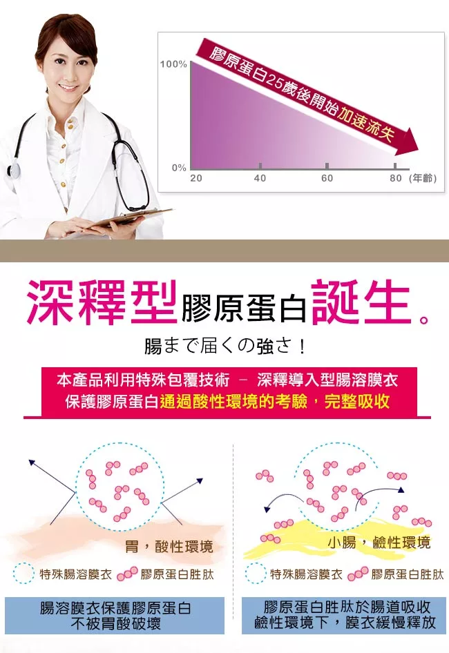 本產品利用特殊包覆技術~腸溶性膜衣,保護膠原蛋白通過胃酸的考驗,較完整送至腸道吸收。